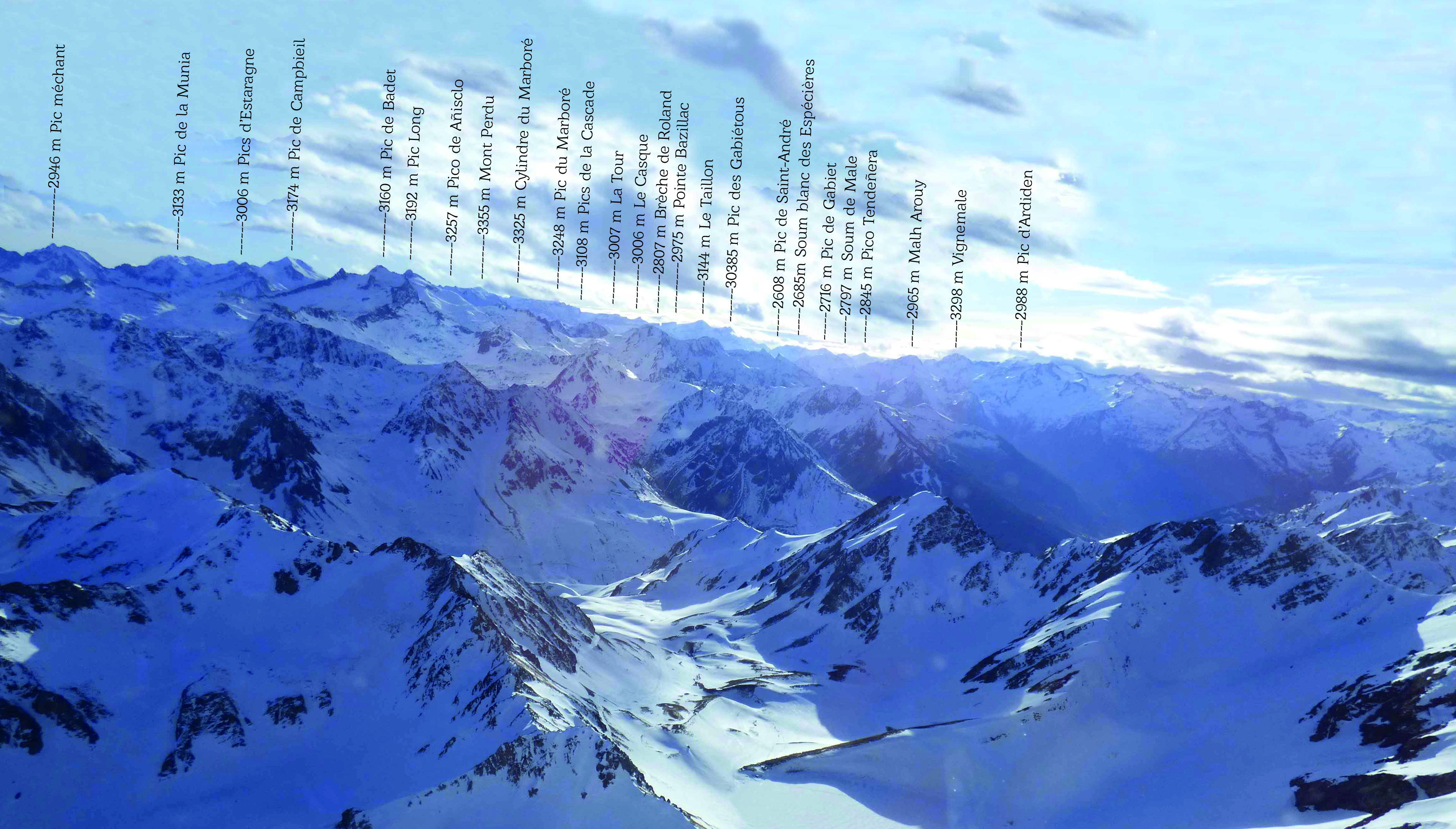 Fanas de los Pirineos, la foto de "Cruzar los Pirineos con esquís o por las estribaciones" el Juego está tomada del Pic de Midi de Bigorre. Estos son algunos de los picos que se ven en esta foto.